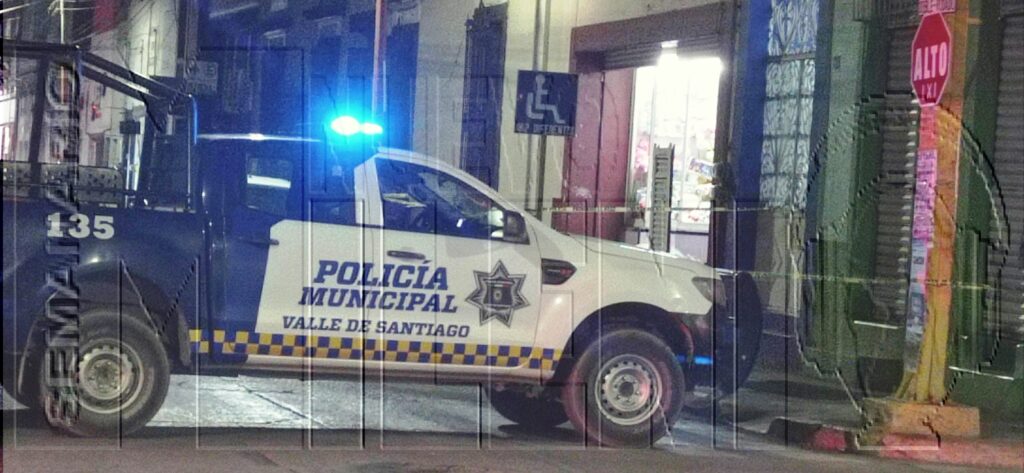 VALLE DE SANTIAGO, GTO.- La noche de este jueves 11 de mayo fue asesinada una persona en pleno centro de la ciudad, a escasos metros de la presidencia Municipal, recibió varios impactos de arma de fuego y cayó sin vida a la entrada de un negocio de venta de regalos.