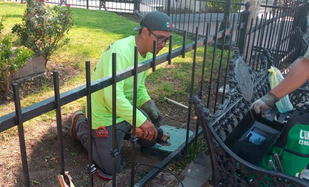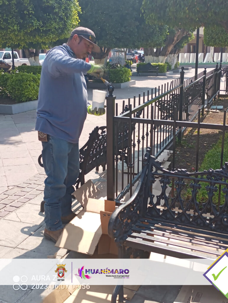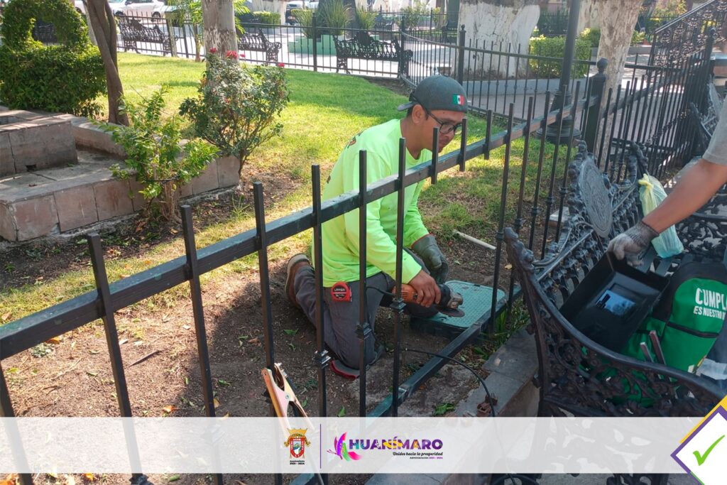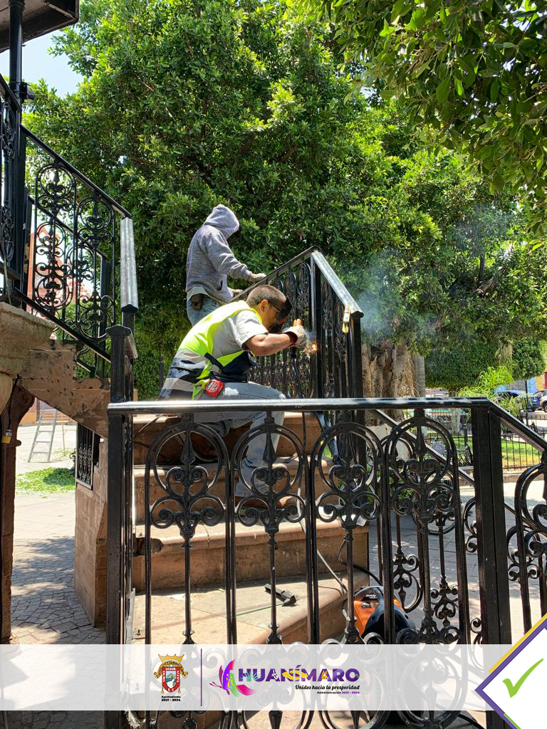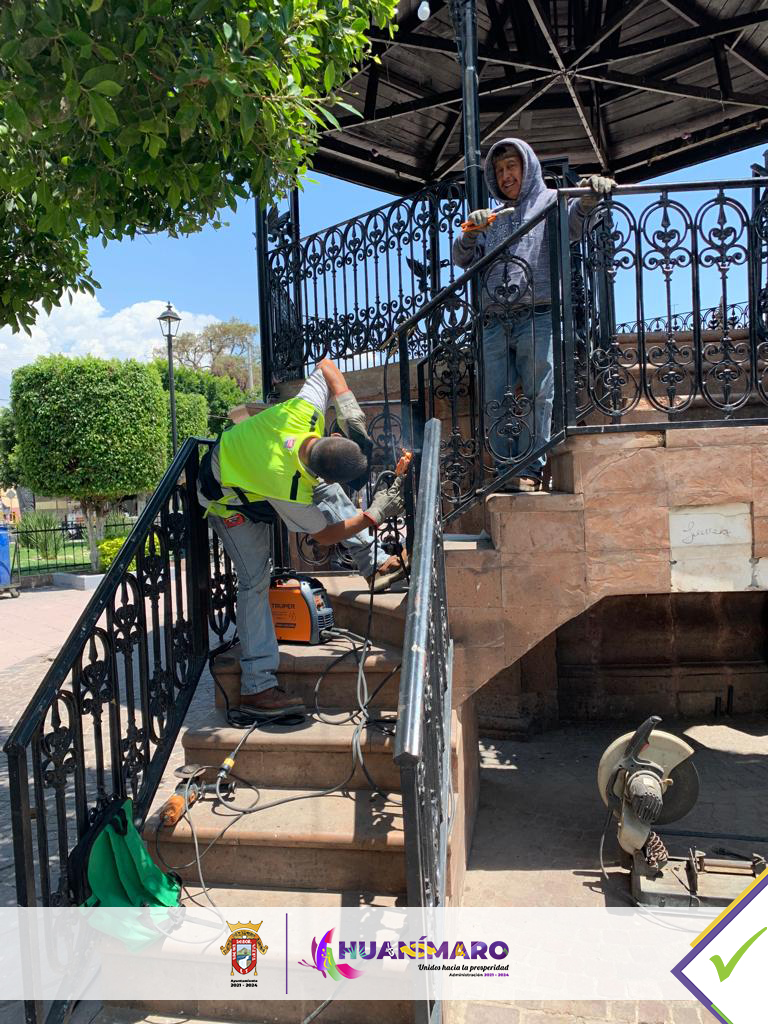Huanimaro.-El mantenimiento a los espacios públicos, además de embellecer nuestro Municipio, hace de estos un lugar digno para el desarrollo y convivencia de las Familias; a través del área de Servicios Básicos se realiza la rehabilitación de rejas en Kiosco y barandales de Plaza Principal en Cabecera Municipal.