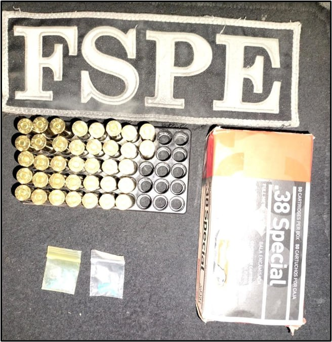 Por ello, le indicaron el alto y tras aplicarle una revisión preventiva le fue asegurada una caja con 37 cartuchos completos, calibre .38 especial, así como dos bolsitas tipo ziploc que contenían una sustancia granulada y transparente con las características del cristal El detenido se identificó como Nery “N” de 39 años de edad.