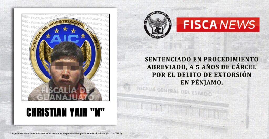 Pénjamo, Gto.- La Fiscalía de Guanajuato comprobó ante un Juez la culpabilidad de CHRISTIAN YAIR “N” en el delito de extorsión a una comerciante en el municipio de Pénjamo, por lo que, en procedimiento abreviado, fue enviado a cumplir una condena de cinco años de cárcel. La ofendida, una comerciante, propietaria de una tienda de abarrotes que habilitó su domicilio particular para tal actividad, el 12 de enero de 2022, vio ingresar a su establecimiento a un sujeto creyendo que se trataba de un cliente, este sujeto se acercó y le dijo: “aquí le manda mi jefe”, e hizo entrega de un pedazo de papel tipo periódico con un número telefónico para que se pusiera en contacto. El domingo 30 de enero de 2022, aproximadamente a las 15:00 horas, el imputado se introdujo en el establecimiento e hizo alarde de portar un arma de fuego fajada en la cintura, ostentándose como miembros de un grupo criminal le exigió a la ofendida una cantidad de dinero y le dió un plazo para conseguirlo, bajo amenazas de causarle daño a ella y a su familia. Tres días después, el imputado regresó y la víctima le hizo entrega del dinero solicitado. A dos meses de lo sucedido, CHRISTIAN YAIR “N” regresó y exigió otra cantidad similar de dinero o bajo la advertencia de que si no lo conseguían quemaría el establecimiento. Esta vez, la ofendida denunció los hechos y Agentes de Investigación Criminal desplegaron un operativo en el cual se concretó la captura del extorsionador.