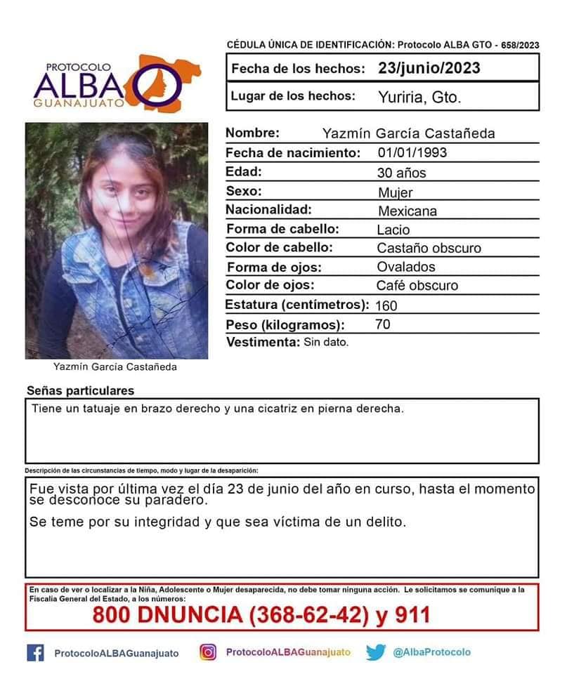 Sobre Yazmín García Castañeda se supo por última vez de ella el pasado viernes 23 de junio alrededor de las 07:30 horas, cuando su madre se percató que su hija no se encontraba en su domicilio ubicado en la comunidad de Santa Mónica Ozumbilla perteneciente al municipio de Yuriria, por lo que pensó que se habría ido a trabajar al municipio de Valle de Santiago.