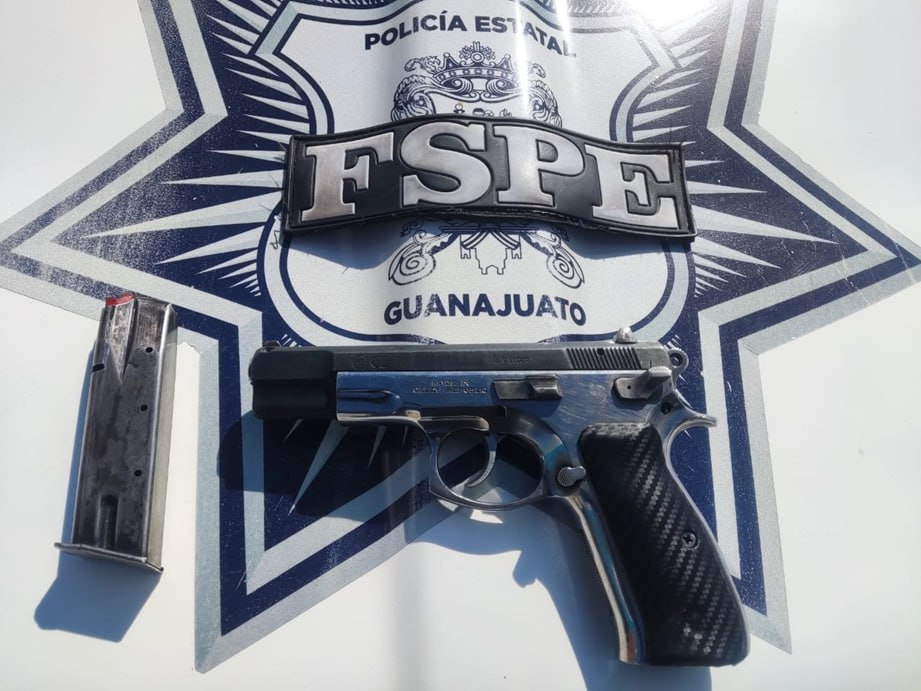 Tras una oportuna reacción, fue detenido metros adelante esta persona a quien luego de aplicarle una revisión preventiva, le fue asegurada entre sus pertenencias, un arma de fuego corta, calibre .9 milímetros.