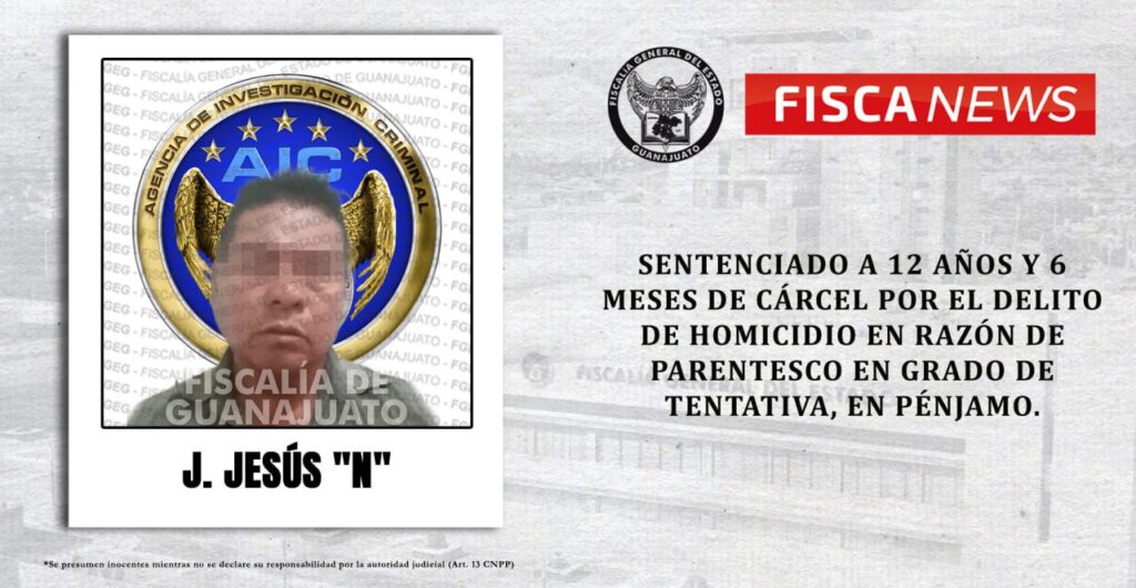En audiencia de juicio oral, el Ministerio Público especializado en litigación, desahogó los elementos jurídicos y probatorios que acreditan la responsabilidad de J. JESÚS “N”, en la comisión del delito de homicidio en razón de parentesco en grado de tentativa, al intentar asesinar a su hermano en el municipio de Pénjamo; esto lo hizo acreedor a una sentencia de 12 años y seis meses encerrado en un reclusorio.