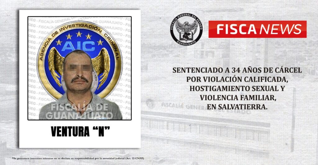 Salvatierra, Gto.- 27 de julio de 2023.- Un hombre llamado VENTURA “N”, fue sentenciado a 34 años de cárcel al ser encontrado culpable de los delitos de violación calificada, hostigamiento sexual y violencia familiar en contra de dos víctimas menores de edad, en la ciudad de Salvatierra.