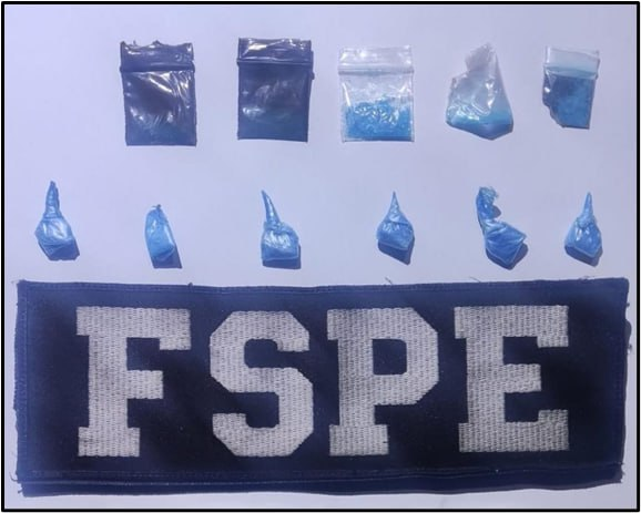 En otro hecho registrado en la zona centro de Salvatierra, policías de las FSPE al realizar labores de patrullaje sobre la calle Benito Juárez, lograron detener a Víctor “N” de 27 años de edad, quien traía consigo 11 dosis de una sustancia granulada de color azul con las características del cristal.