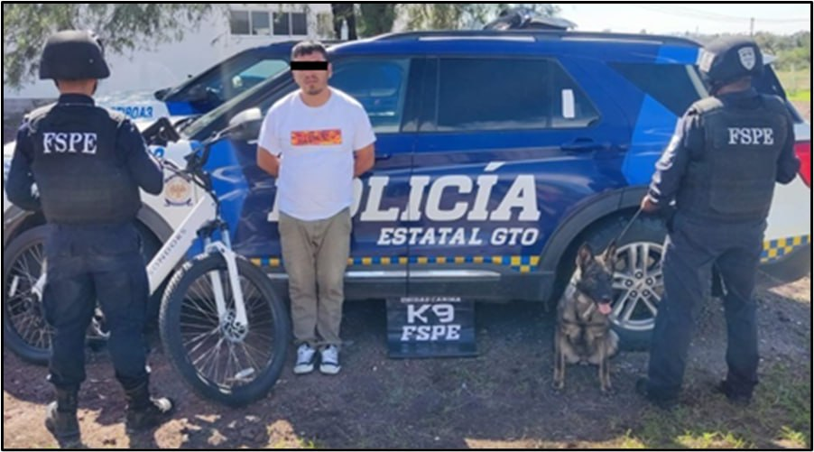 Cortazar, Gto., 12 de agosto de 2023.- Derivado labores de patrullaje y vigilancia realizadas en esta ciudad, Policías de la Unidad Canina K9 de las Fuerzas de Seguridad Pública del Estado, lograron el aseguramiento de un hombre que estaba en posesión de varias dosis de droga con las características del cristal.