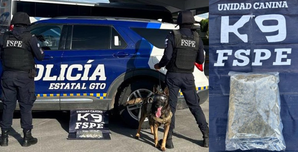Celaya, Gto., 28 de agosto de 2023.- Durante operativos realizados a empresas de paquetería, elementos de la Unidad Canina K9 de las Fuerzas de Seguridad Pública del Estado (FSPE), lograron asegurar al interior de uno de este tipo de establecimientos, un total 600 dosis de una hierba verde y seca con las características de la mariguana.