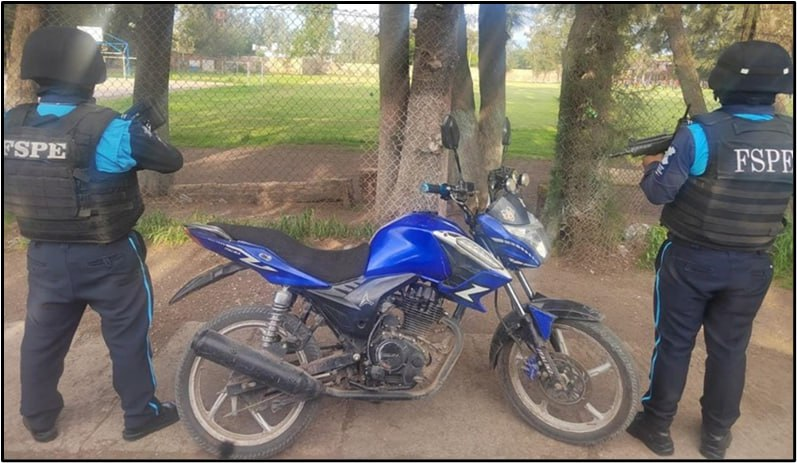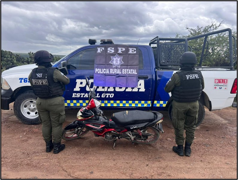 Por último, en el municipio de Salamanca, durante un patrullaje realizado sobre la carretera federal 45 Salamanca-Villagrán, a la altura de la comunidad San José, localizaron una motocicleta marca Italika, modelo 2022, color negro, línea DM150, sin tablilla de circulación. Tras verificar estos datos en el C5i, se estableció que contaba con reporte de robo.