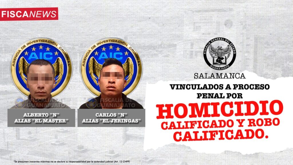 Salamanca, Gto.- 23 de septiembre de 2023.- La Fiscalía de Guanajuato cumplimentó órdenes de aprehensión contra “El Master” y “El Jeringas”, como presuntos responsables del asesinato de un adolescente en la colonia Las Misiones en Salamanca. El Ministerio Público obtuvo que fueran vinculados a proceso penal por los delitos de homicidio calificado y robo calificado.