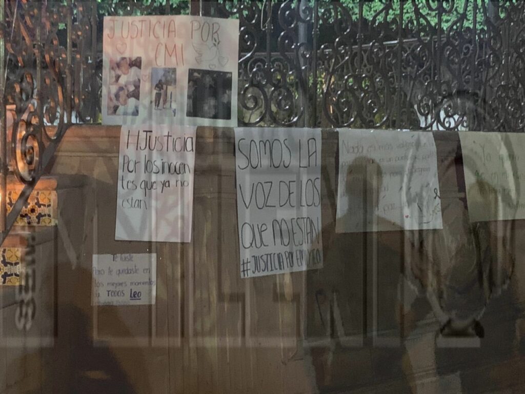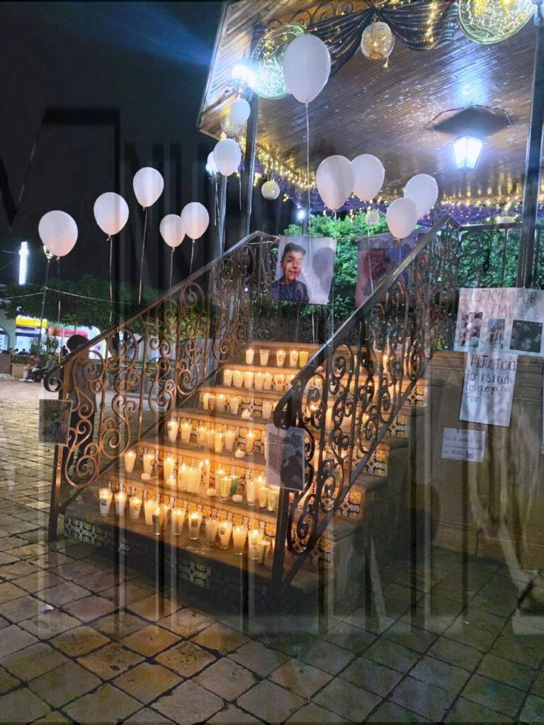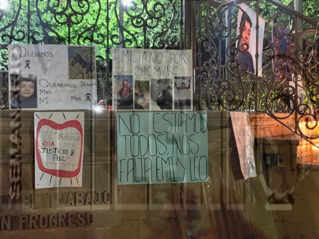 Así mismo, en el kiosco de la plaza pública colocaron cartulinas con diversos mensajes, exigiendo justicia y pidiendo paz, “Somos la voz de los que ya no están”, “Justicia por los inocentes que ya no están”, “Te fuiste, pero te quedaste en los mejores momentos, Leo”, “NO se puede Ignorar a la gente que pide un cambio”, “No estamos todos, nos falta Emi y Leo”. “El Pueblo Gita y pide Justicia y Paz”, “Queremos Justicia, no queremos perder más amigos, ni uno más”, “Emiliano por siempre”.