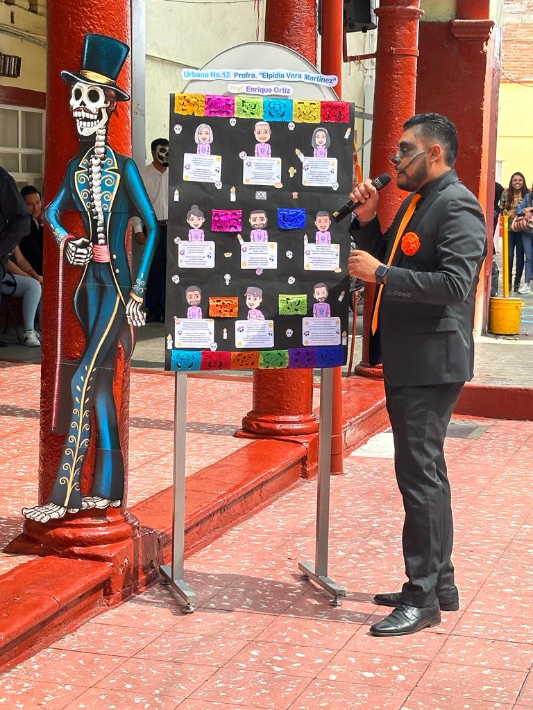 El personal de la Primaria Urbana no. 12 realizó una breve narrativa de La Catrina, previo a un vistoso desfile de catrinas y catrines con el que se cerró el programa alusivo al Día de Muertos.