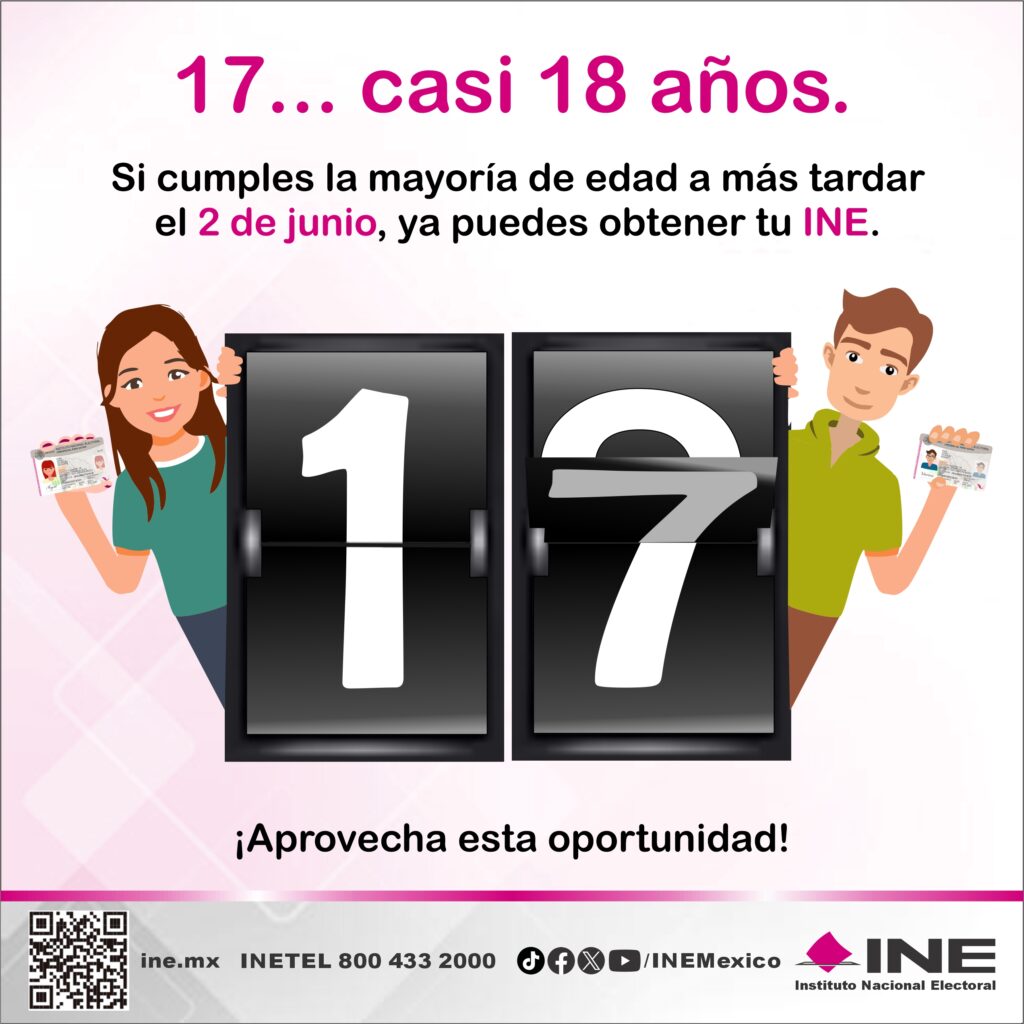 Al respecto, el Vocales Ejecutivo, el Mtro. Alejandro Elizarrarás Corona y del Registro Federal de Electores, el Lic. Jorge Amado Vergara Campos de la 13 Junta Distrital Ejecutiva; invita a los jóvenes que cumplan 18 años antes del 2 de junio del 2024 para que tramiten por su credencial para votar y así participar con su voto en las siguientes elecciones del 2024, para ello tienen del 1 de septiembre del 2023 hasta el 22 de enero del 2024 para hacerlo.
