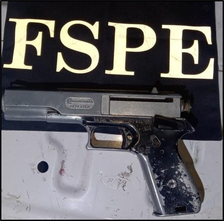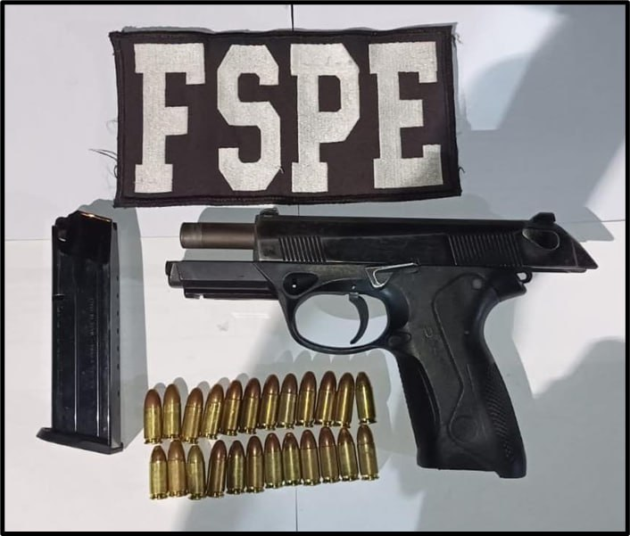 Por ello, los policías de las FSPE les dieron alcance y tras aplicarles una revisión preventiva, les fue localizado entre sus pertenencias, un arma de fuego corta calibre .9 milímetros, un cargador metálico, así como un total de 24 cartuchos del mismo calibre.