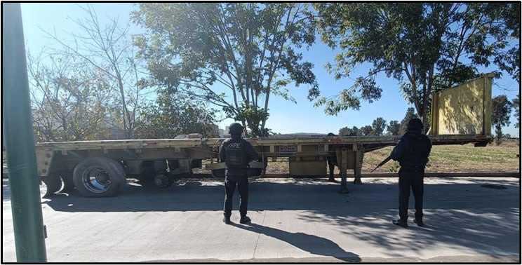 Luego de que se acercaron, los uniformados estatales verificaron los datos de la unidad mediante el Sistema Estatal C5i, donde arrojó que contaba con reporte de robo. Se trata de un remolque de tráiler marca Ferbus, modelo 2019, tipo plataforma, color amarillo.