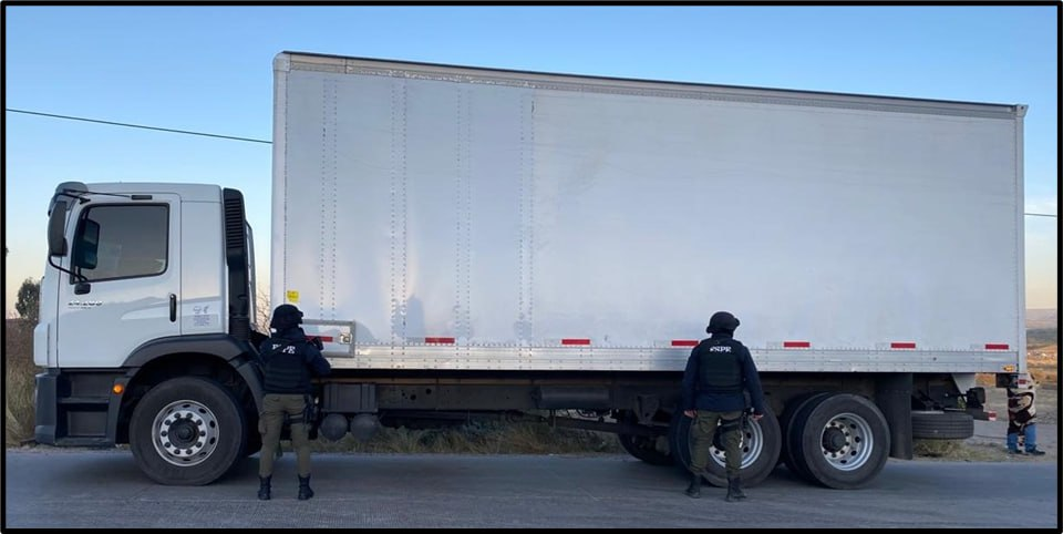 En tanto, policías de la PEC que realizaba labores de patrullaje en el mismo tramo carretero antes referido, tuvieron a la vista un remolque tipo caja seca estacionado a un costado de la cinta de rodamiento. Al acercarse, los efectivos de las FSPE consultaron los datos en el C5i, donde arrojó que cuenta con reporte de robo, se trata de un remolque marca Utility, tipo caja seca, color blanco, con placas de procedencia extranjera.