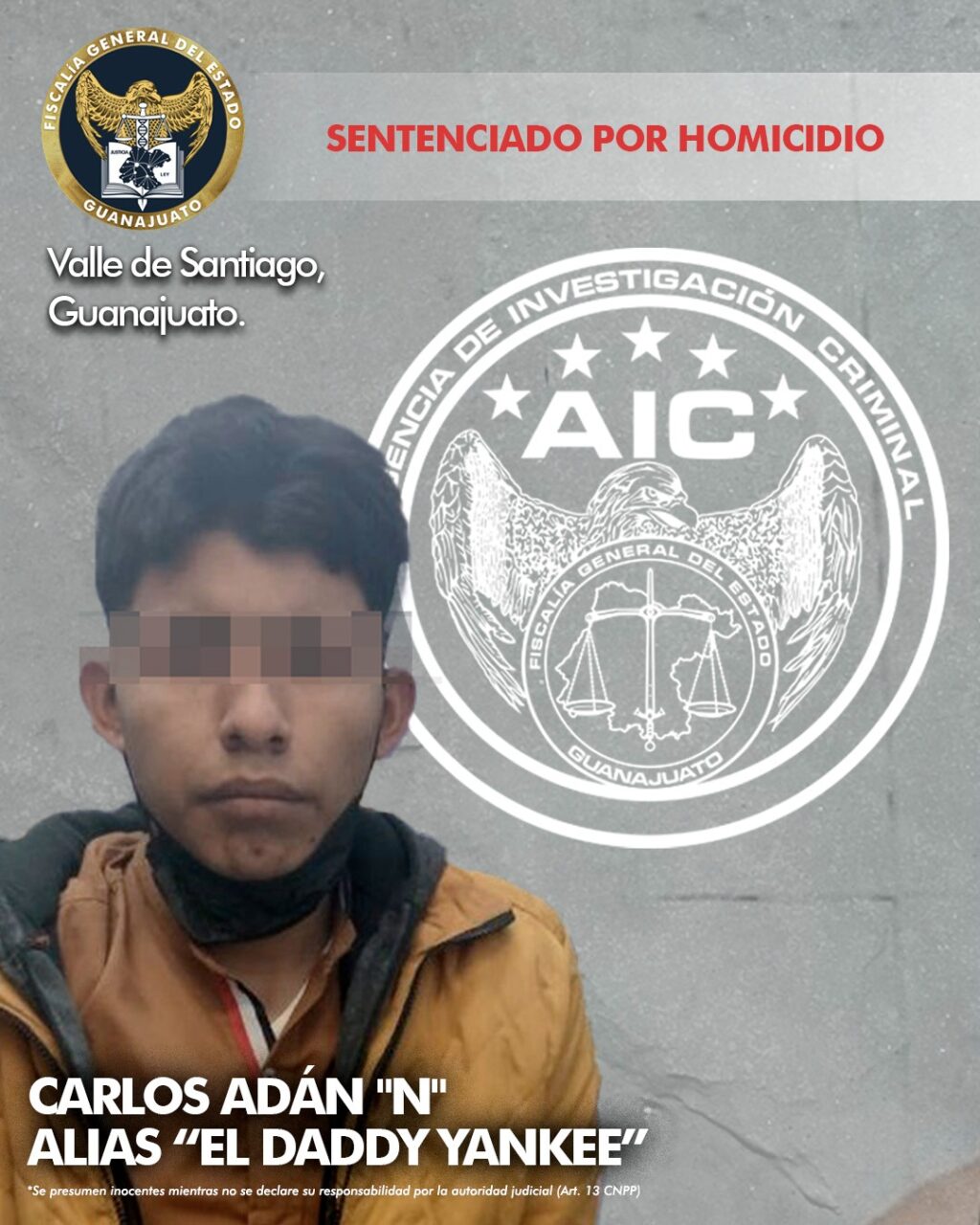 Valle de Santiago, Gto. 22 de marzo de 2024.- CARLOS ADÁN “N” alias “El Daddy Yankee” ha sido sentenciado por el homicidio de un joven apodado “El Chino”, ocurrido el 18 de diciembre de 2021, en la colonia El Socorro de Valle de Santiago.