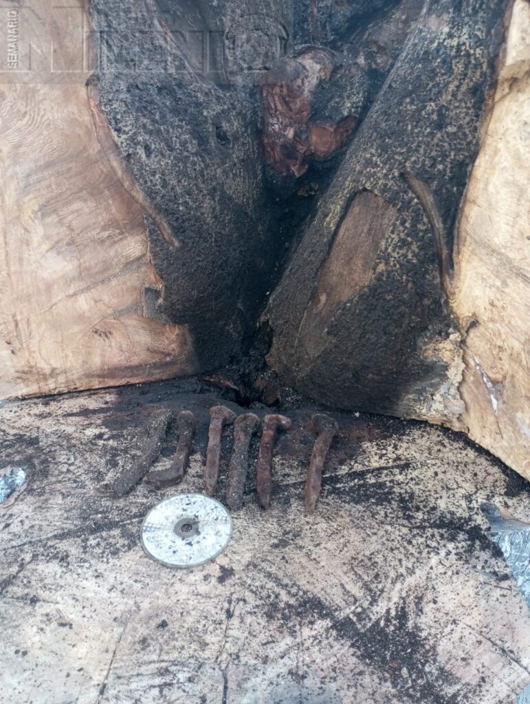Valle de Santiago, Gto.- Esta mañana, trabajadores de servicios públicos municipales localizaron al interior de un árbol seco de la Alameda, de manera extraña un pequeño charco de agua, una varilla, 6 clavos de riel, tierra y unas piedras de cerro.