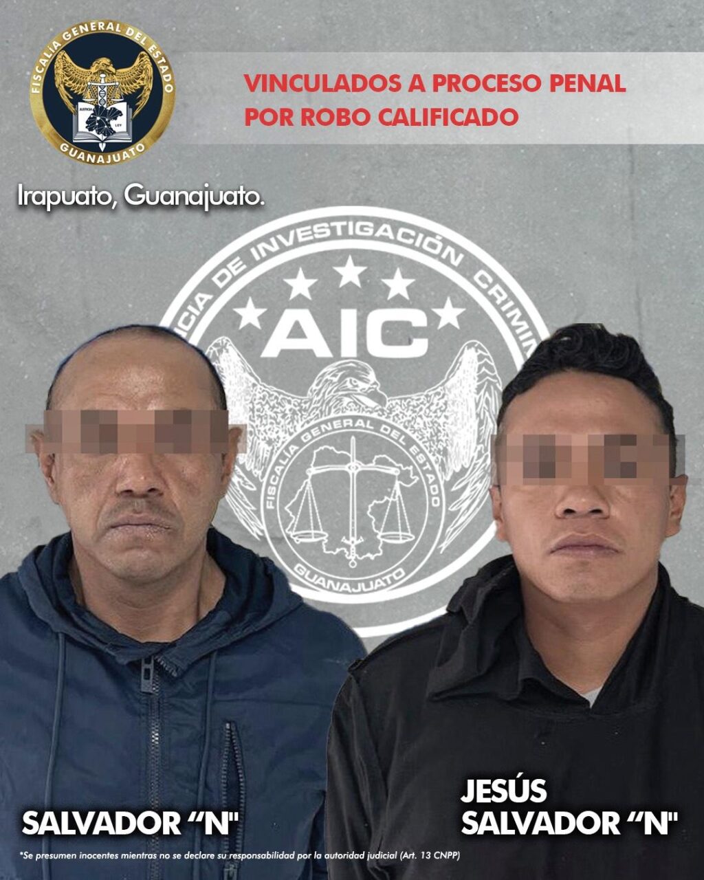 Irapuato, Gto. 29 de abril de 2024.- La Fiscalía de Guanajuato obtuvo vinculación a proceso penal en contra de dos hombres por el delito de robo calificado, cometido a principios del mes pasado en la ciudad de Irapuato.