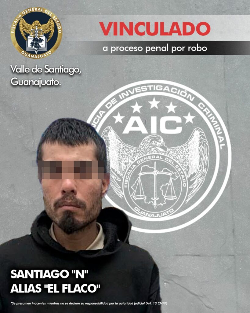Durante audiencia de control, el Agente del Ministerio Público de la Fiscalía de Guanajuato aportó los datos de prueba suficientes y solicitó al Juez vinculación a proceso penal para SANTIAGO “N” por el delito de robo calificado.