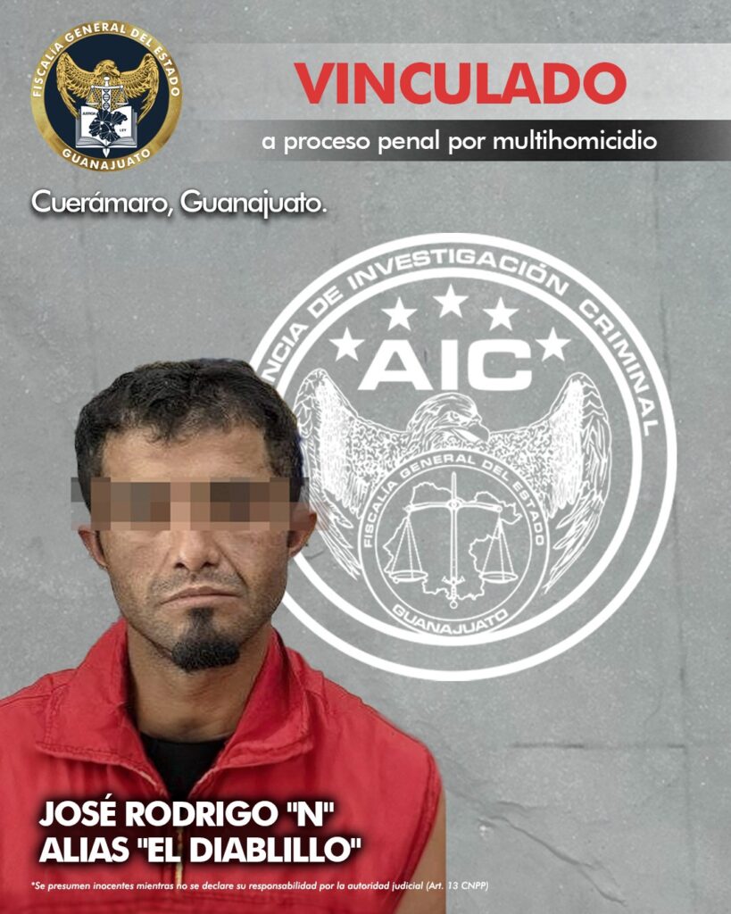 Cuerámaro, Gto. 10 de octubre de 2024.- JOSÉ RODRIGO “N” alias “El Diablillo” fue capturado por Agentes de Investigación Criminal de la Fiscalía de Guanajuato, quien obtuvo su vinculación a proceso penal por el homicidio de cuatro hombres en el municipio de Cuerámaro.