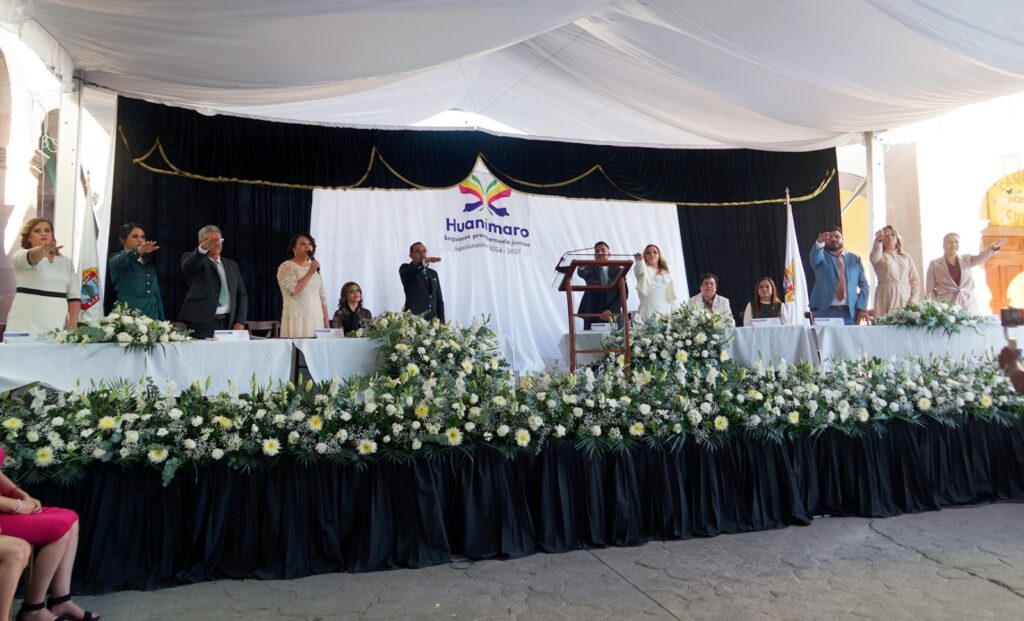 Huanímaro Gto a 11 de Octubre del 2024.- Se llevó a cabo la ceremonia de instalación del nuevo ayuntamiento cuyo periodo comprenderá del 2024-2027. Evento realizado frente a los portales de presidencia municipal ante cientos de Huanimarenses que nuevamente ratificaron la confianza ante los logros alcanzados en el trienio anterior por parte de la alcaldesa Laura Villalpando Arroyo.