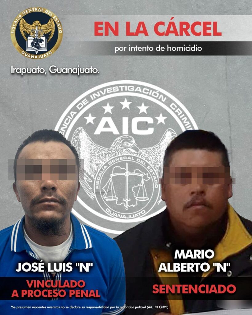 Irapuato, Gto. 28 de octubre de 2024.- Por el delito de homicidio en grado de tentativa, la Fiscalía de Guanajuato logró que JOSÉ LUIS “N” fuera vinculado a proceso penal y que MARIO ALBERTO “N” fuera sentenciado; ambos por hechos distintos registrados en el municipio de Irapuato.