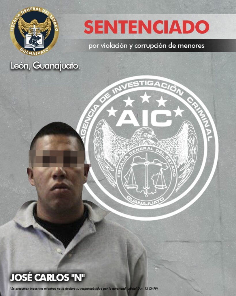 León, Gto. 11 de noviembre de 2024.- En juicio oral, la Fiscalía de Guanajuato demostró que JOSÉ CARLOS “N” es responsable de haber cometido los delitos de violación y corrupción de menores, en agravio de una víctima, por lo que recibió una sentencia de 28 años y 4 meses de cárcel.