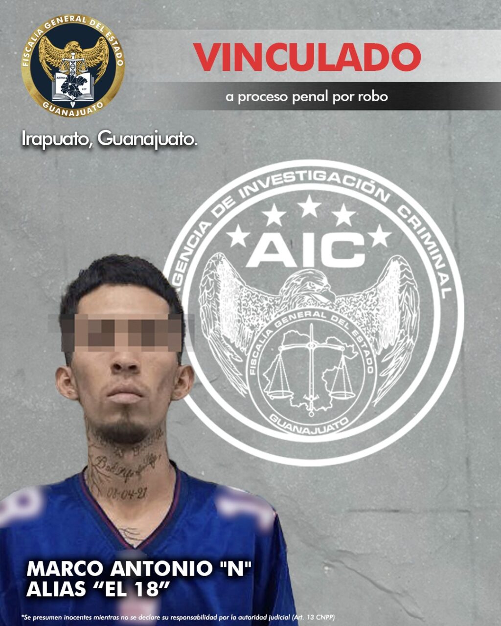 Irapuato, Gto. 02 de diciembre de 2024.- La Fiscalía de Guanajuato cumplimentó orden de aprehensión en reclusión por el delito de robo calificado en contra de MARCO ANTONIO “N” alias “El 18”, quien se encuentra preso por el homicidio de los Agentes de Tránsito, Antonio “N” y Claudia Karina, ocurrido el 03 de marzo de 2024.
