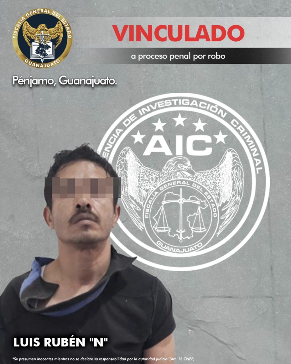 Pénjamo, Gto. 03 de diciembre de 2024.- La Fiscalía de Guanajuato logró que LUIS RUBÉN “N”, fuera vinculado a proceso penal por robo a transeúntes. El inculpado utilizó una réplica de arma de fuego para cometer el ilícito en la ciudad de Pénjamo.