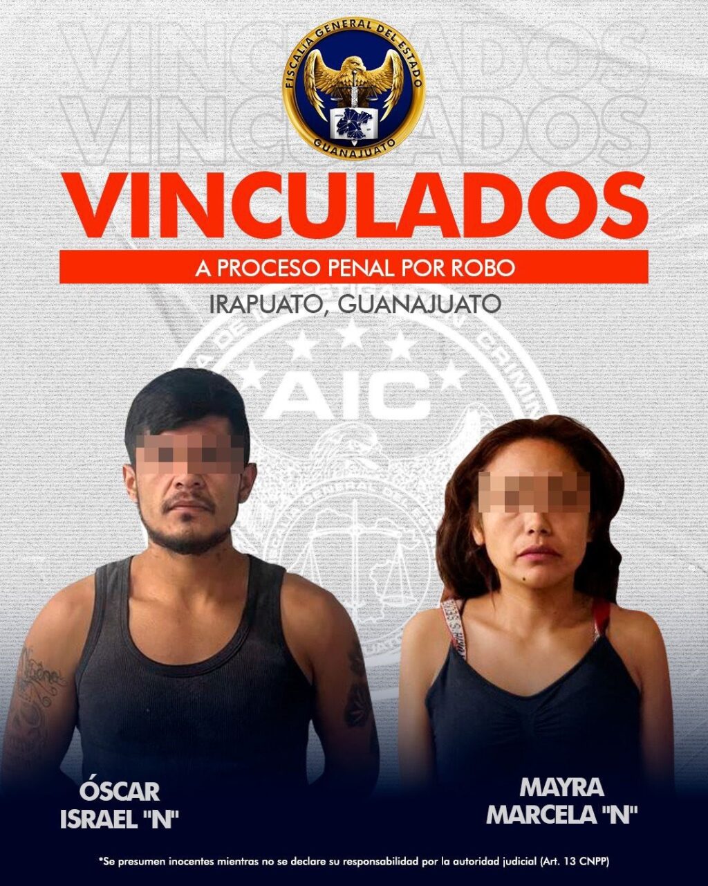 La Fiscalía General del Estado de Guanajuato informa que, en cumplimiento de una orden de aprehensión, fueron detenidos MAYRA MARCELA “N” y ÓSCAR ISRAEL “N” por su presunta responsabilidad en el delito de robo calificado.