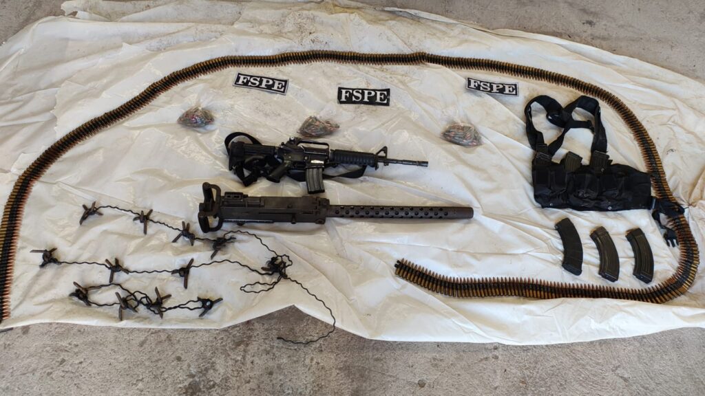 Entre los objetos asegurados se encuentran un arma larga de alto alcance y precisión, la ametralladora Browning con capacidad de penetrar blindajes, con cinta abastecida con 500 cartuchos útiles.