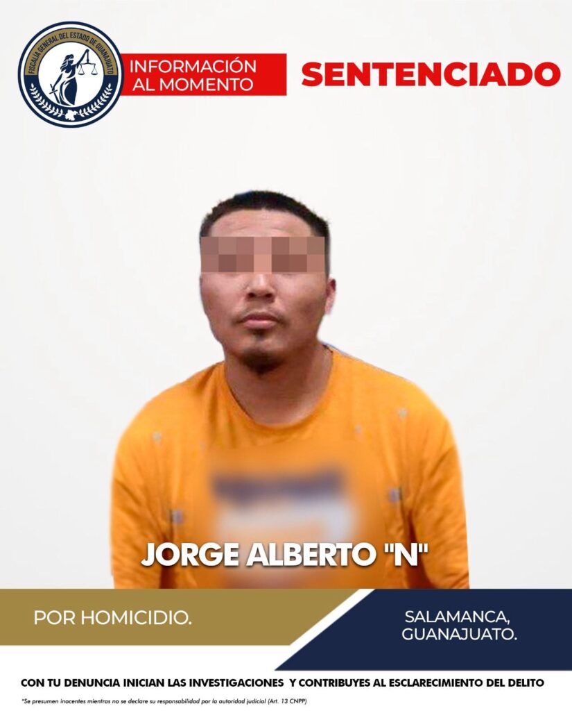 La Fiscalía General del Estado de Guanajuato logró que JORGE ALBERTO “N” fuera sentenciado tras acreditar su responsabilidad en el delito de homicidio ocurrido en la ciudad de Salamanca.