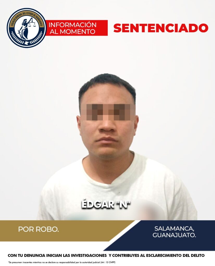 La Fiscalía General del Estado de Guanajuato logró una sentencia condenatoria en procedimiento abreviado contra ÉDGAR “N”, tras acreditar su responsabilidad en el delito de robo calificado en la ciudad de Salamanca.
