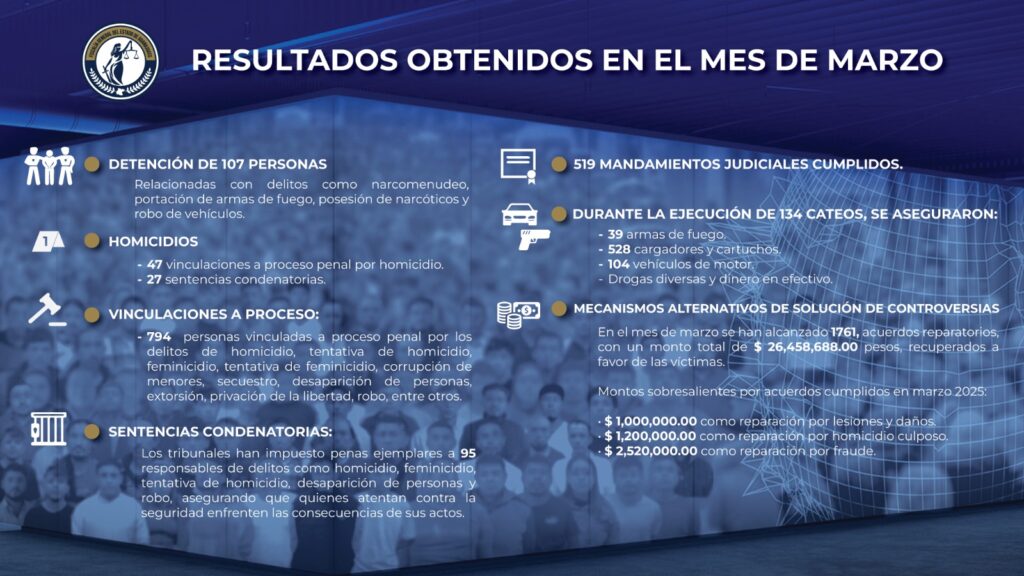 Gracias a estas acciones, un importante número de detenidos fueron vinculados a proceso penal, mientras que otros recibieron sentencias condenatorias por delitos de alto impacto como secuestro, desaparición de personas, homicidio, feminicidio, trata de personas y robo, entre otros.