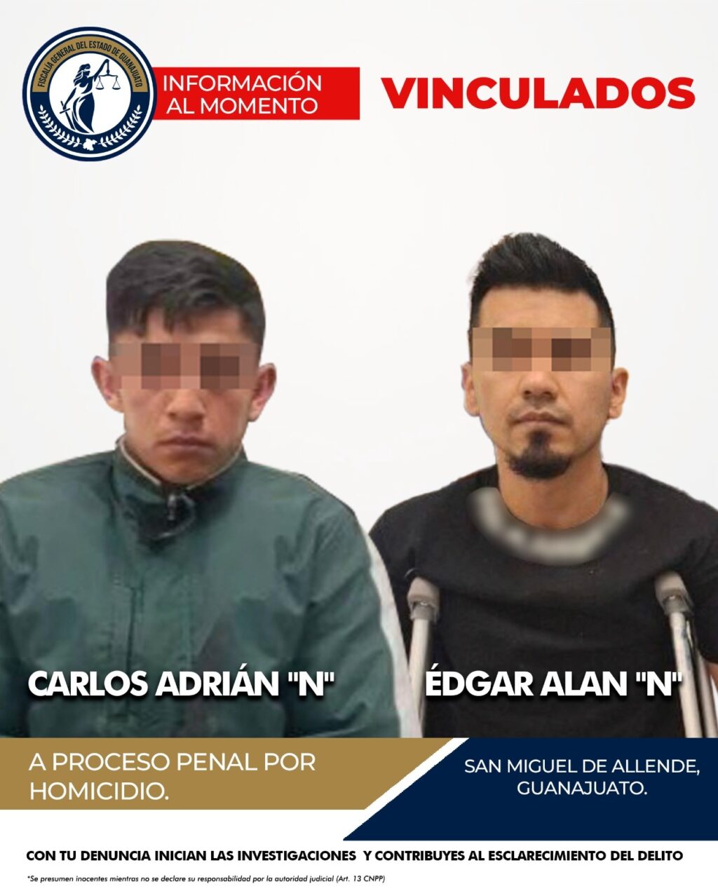 Agentes de Investigación de la Fiscalía General del Estado de Guanajuato cumplieron las ordenes de aprehensión para capturar a CARLOS ADRIÁN “N”, alias “El Maletas” y a ÉDGAR ALAN “N”, “El Cachorro”, presuntos responsables del delito de homicidio, ocurrido en el interior de un bar de San Miguel de Allende.