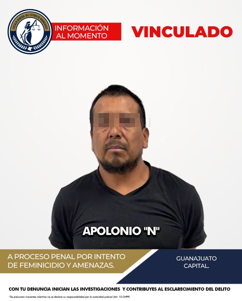 La Fiscalía General del Estado de Guanajuato inició una carpeta de investigación por el delito de feminicidio en grado de tentativa y amenazas, cuyos elementos de prueba que la integran permitieron obtener el mandamiento judicial para aprehender a APOLONIO “N”, quien fue vinculado a proceso penal por los delitos citados. Actualmente, se encuentra bajo prisión preventiva mientras continúan las investigaciones.