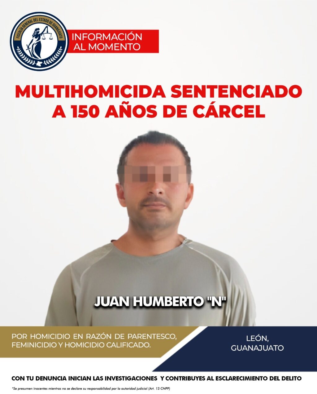 La Fiscalía General del Estado consiguió una de las sentencias más severas registradas en la entidad bajo el sistema tradicional de justicia: 150 años de prisión para JUAN HUMBERTO “N”, declarado culpable de asesinar a sangre fría a cuatro miembros de su familia en un crimen que sacudió a la ciudad de León en 2015.