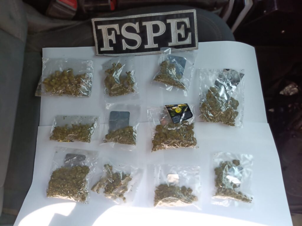 Durante la revisión se le localizaron 11 bolsitas de plástico que contenían aproximadamente 63 gramos de una sustancia vegetal verde y seca, con características similares a la marihuana, la cual llevaba oculta en la bolsa frontal de su bermuda. Fue puesto a disposición de la Fiscalía General del Estado (FGE) para las investigaciones correspondientes.