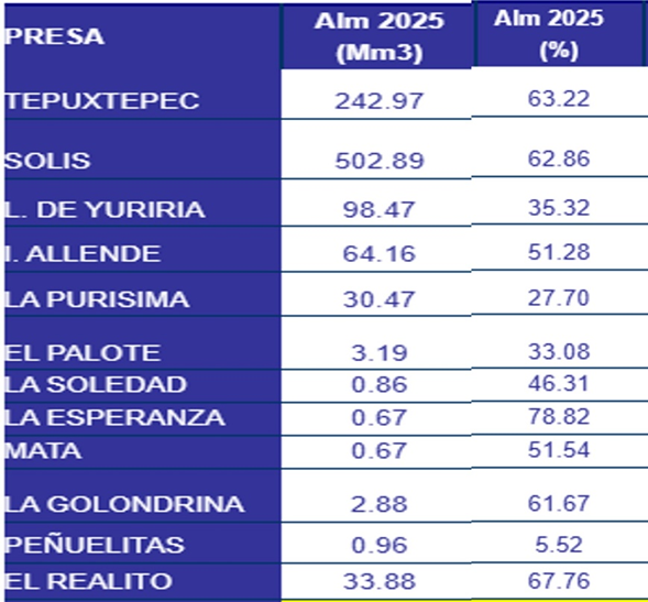 Las principales presas de la entidad presentan un porcentaje promedio de almacenamiento de 55.1 por ciento, al registrar 982.1 millones de metros cúbicos.