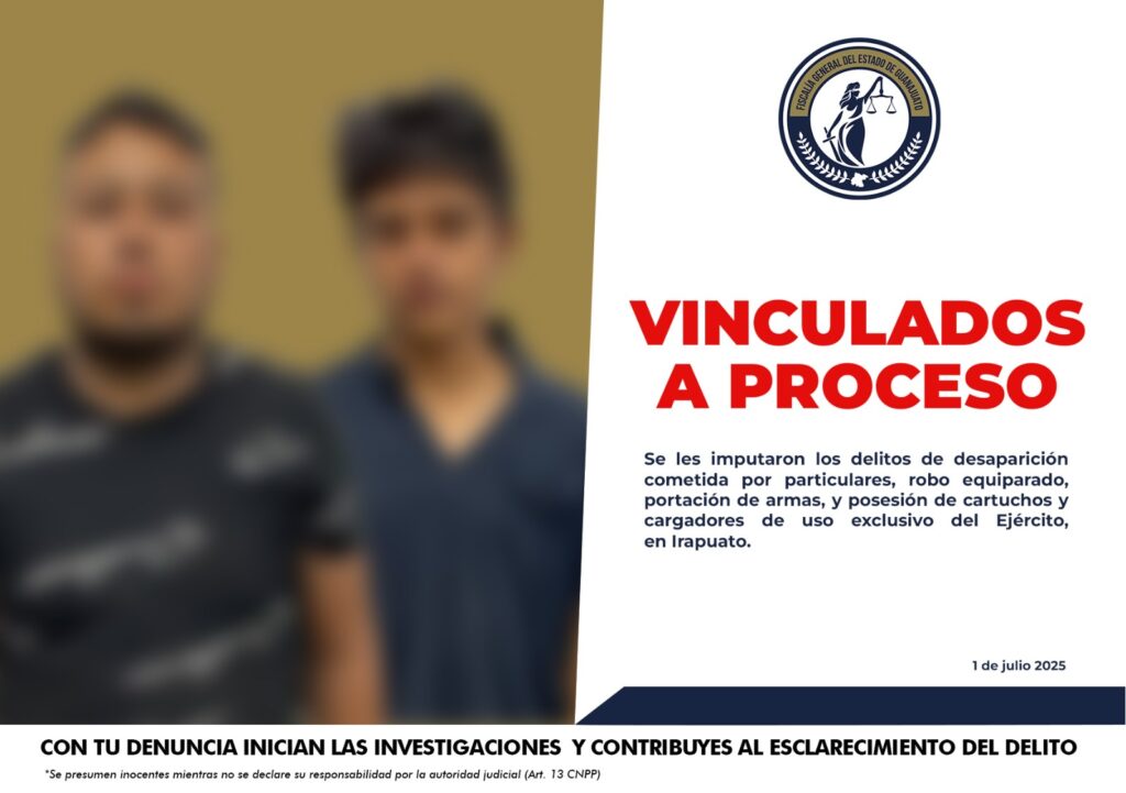 Los detenidos quedaron a disposición de la Fiscalía del Estado, junto con lo asegurado. JUAN MARTÍN “N” y JORGE ALBERTO “N” como se les identificó legalmente, fueron llevados a audiencia de control de detención donde el Ministerio Público de Guanajuato dio a conocer DATOS DE pruebas que demuestran su probable responsabilidad en los delitos de desaparición cometida por particulares, robo equiparado, portación de armas, y posesión de cartuchos y cargadores de uso exclusivo del Ejército.