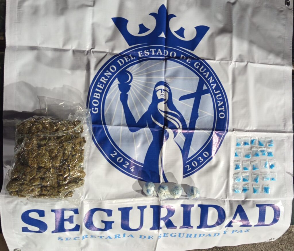 El hombre fue identificado como Diego Serafín “N”, de 34 años de edad y con domicilio en la comunidad San Miguel Octopan, municipio de Celaya. Durante la inspección se le aseguró un paquete con 502 gramos de hierba verde con características propias de la marihuana, así como 24 dosis de una sustancia con apariencia de cristal.