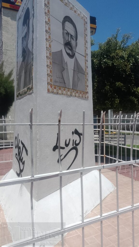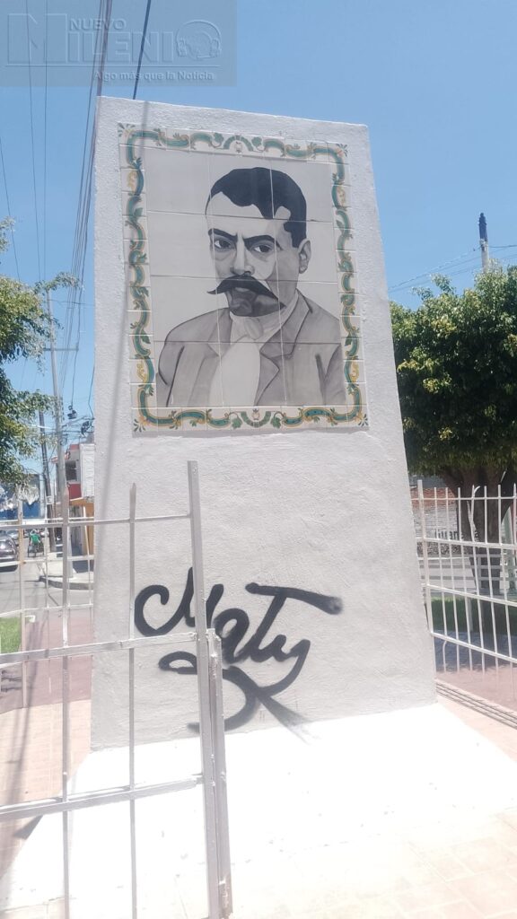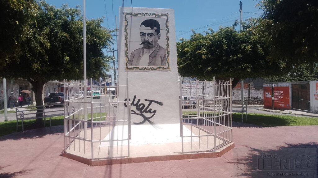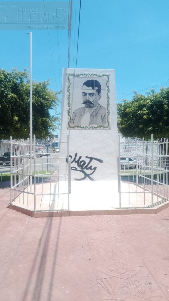 Valle de Santiago, Gto. — El Monumento a la Revolución, ubicado en la glorieta que lleva su nombre,en la colonia Emiliano Zapata amaneció nuevamente con pintas de graffiti, incluyendo robo de la la puerta del barandal. Este nuevo acto de vandalismo ha generado indignación entre vecinos y visitantes, quienes lamentan el deterioro de uno de los símbolos históricos de la ciudad.