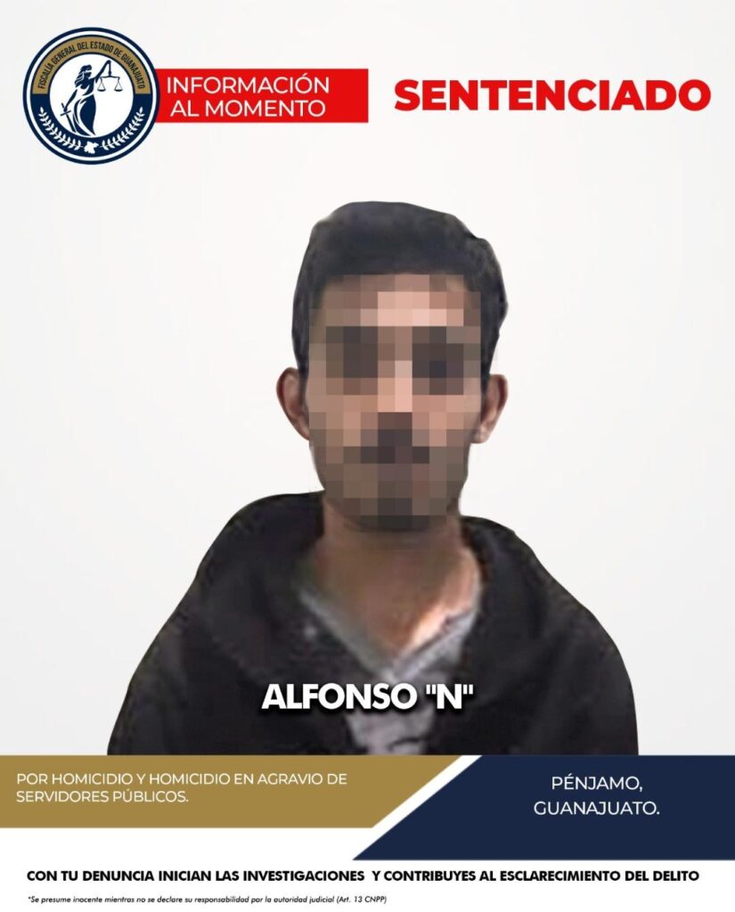 La Fiscalía General del Estado logró que un juez dictara sentencia condenatoria contra ALFONSO “N”, conocido como “el cuate”, por su responsabilidad en el homicidio de dos personas, uno de ellos policía preventivo del municipio de Pénjamo, por lo que se le impuso una pena total de 42 años de cárcel.
