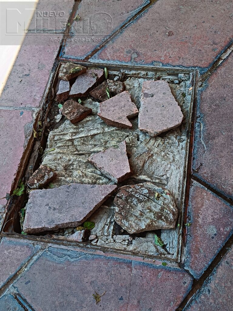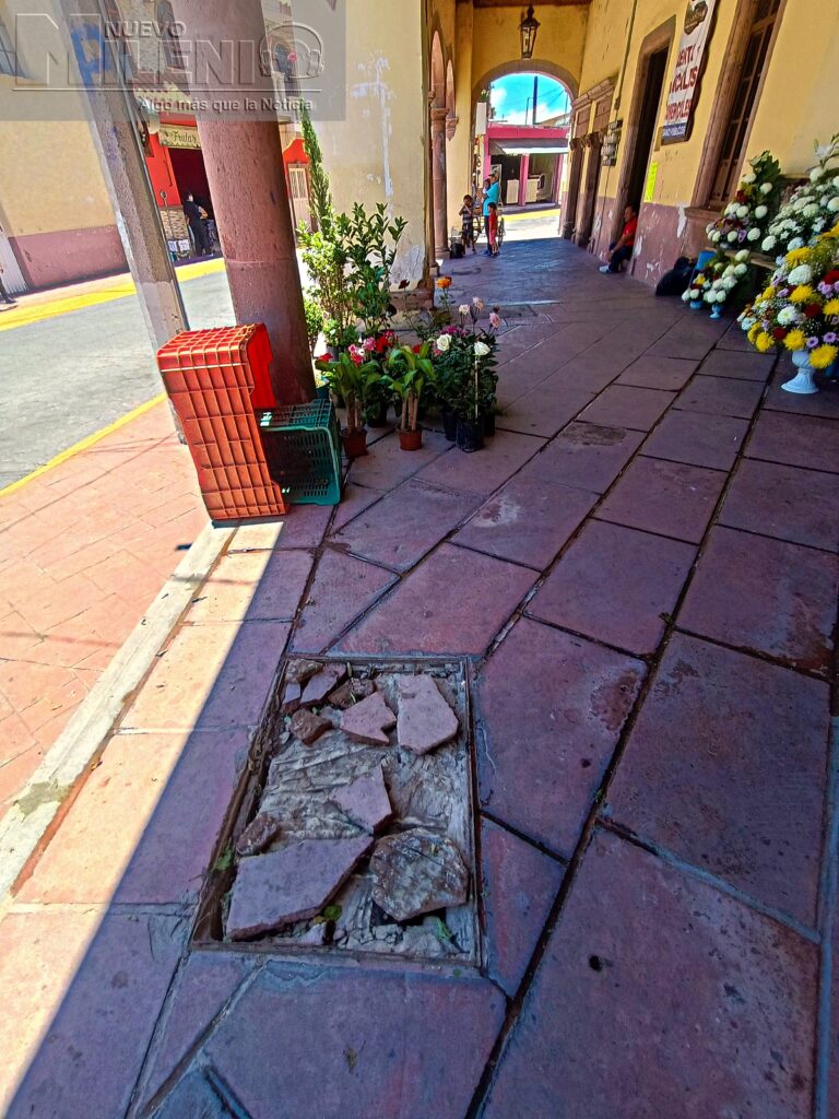 Durante un recorrido por el centro histórico, realizado a petición de vecinos preocupados, se constató el deterioro de varios registros ubicados bajo los portales del jardín principal. Estos representan un serio riesgo para los transeúntes, especialmente para personas de la tercera edad, niños y cualquier ciudadano que pudiera sufrir un accidente al caminar por la zona.