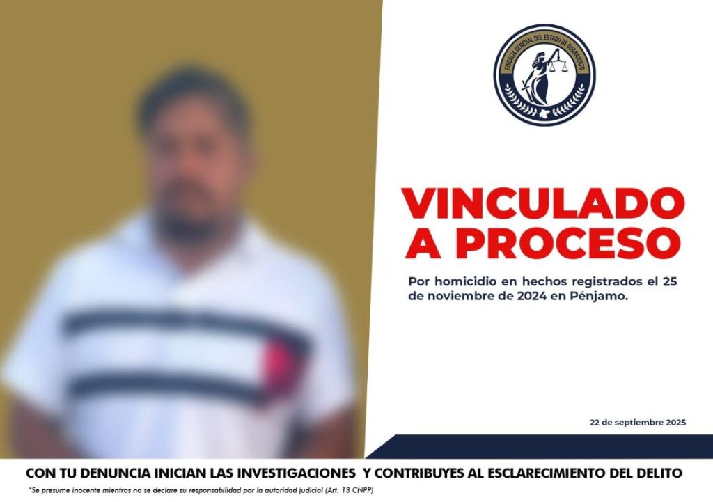 La Fiscalía General del Estado de Guanajuato obtuvo vinculación a proceso penal en contra de JOSÉ JESÚS “N”, por su probable responsabilidad en el delito de homicidio, ocurrido en el municipio de Pénjamo.