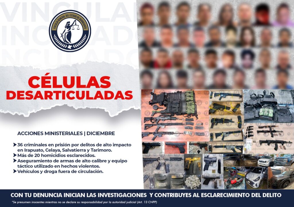 En atención directa a la incidencia delictiva registrada en la región de Irapuato, la Fiscalía General del Estado de Guanajuato durante las últimas semanas de diciembre, como parte de un trabajo permanente desarrolló acciones de investigación y procuración de justicia que se tradujeron en resultados de alto impacto en beneficio de la sociedad, fortaleciendo la seguridad y brindando mayor certeza a las familias guanajuatenses.