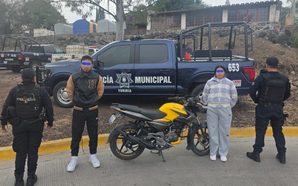 Fue asegurada una motocicleta de la marca Bajaj, tipo deportiva, color amarillo, placas de circulación 96MGH8, con reporte de robo vigente. La unidad era tripulada por Jesús Antonio N, de 27 años, y Naomi N, de 25 años, quienes quedaron en calidad de detenidos y lo asegurado fue puesto a disposición de la Fiscalía General de Justicia del Estado, sede Yuriria.