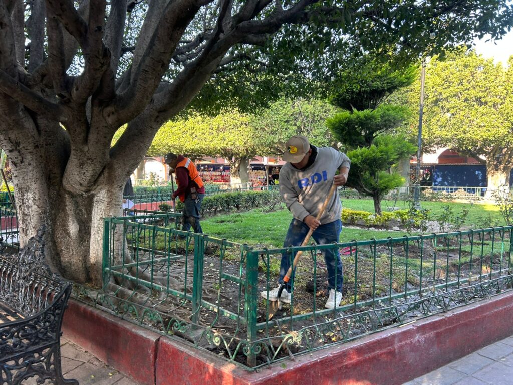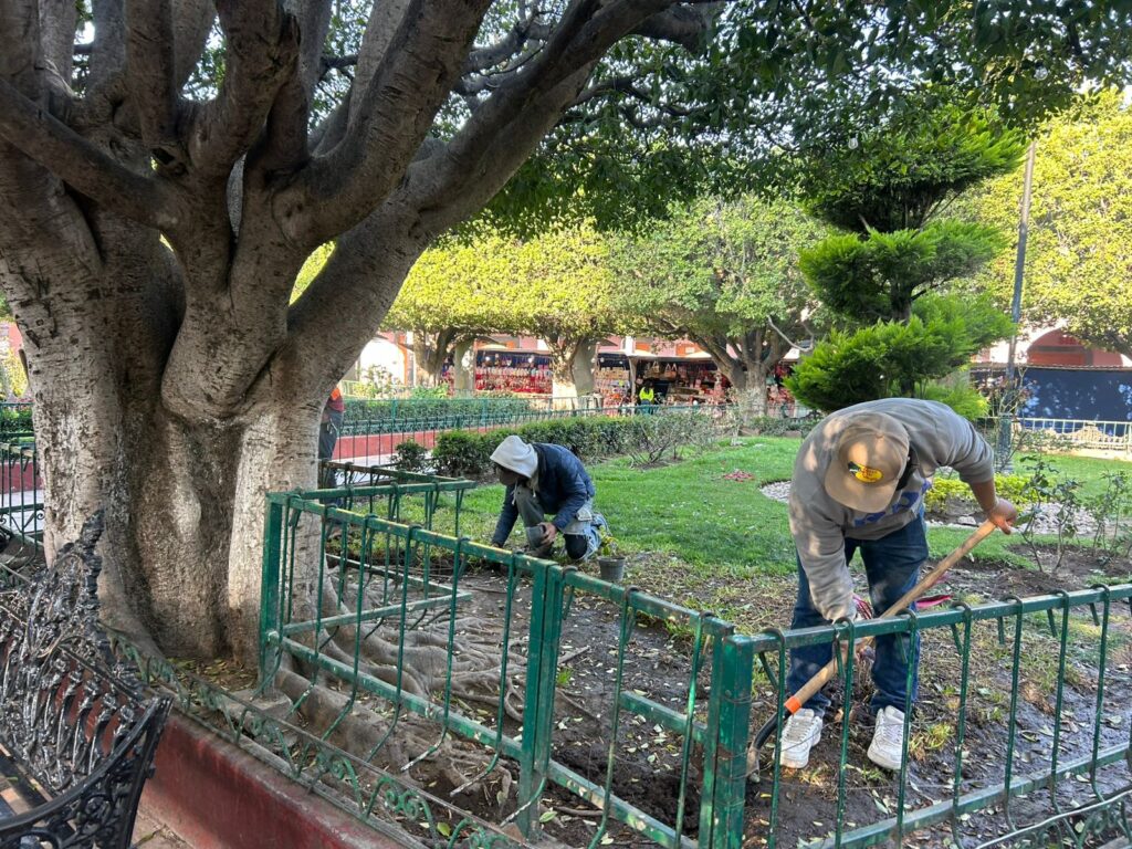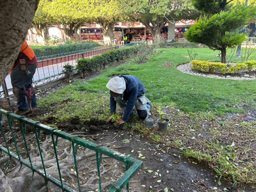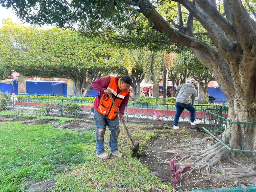 Como parte de estos trabajos, se realizan labores de encalado en áreas públicas, pintura de guarniciones y mantenimiento general de zonas comunes, acciones que permiten brindar mayor orden, limpieza y seguridad visual en vialidades y espacios de convivencia. Asimismo, se lleva a cabo la colocación de plantas ornamentales como amaranto, muñecas y duranta, contribuyendo a generar entornos más agradables y con mayor armonía visual.