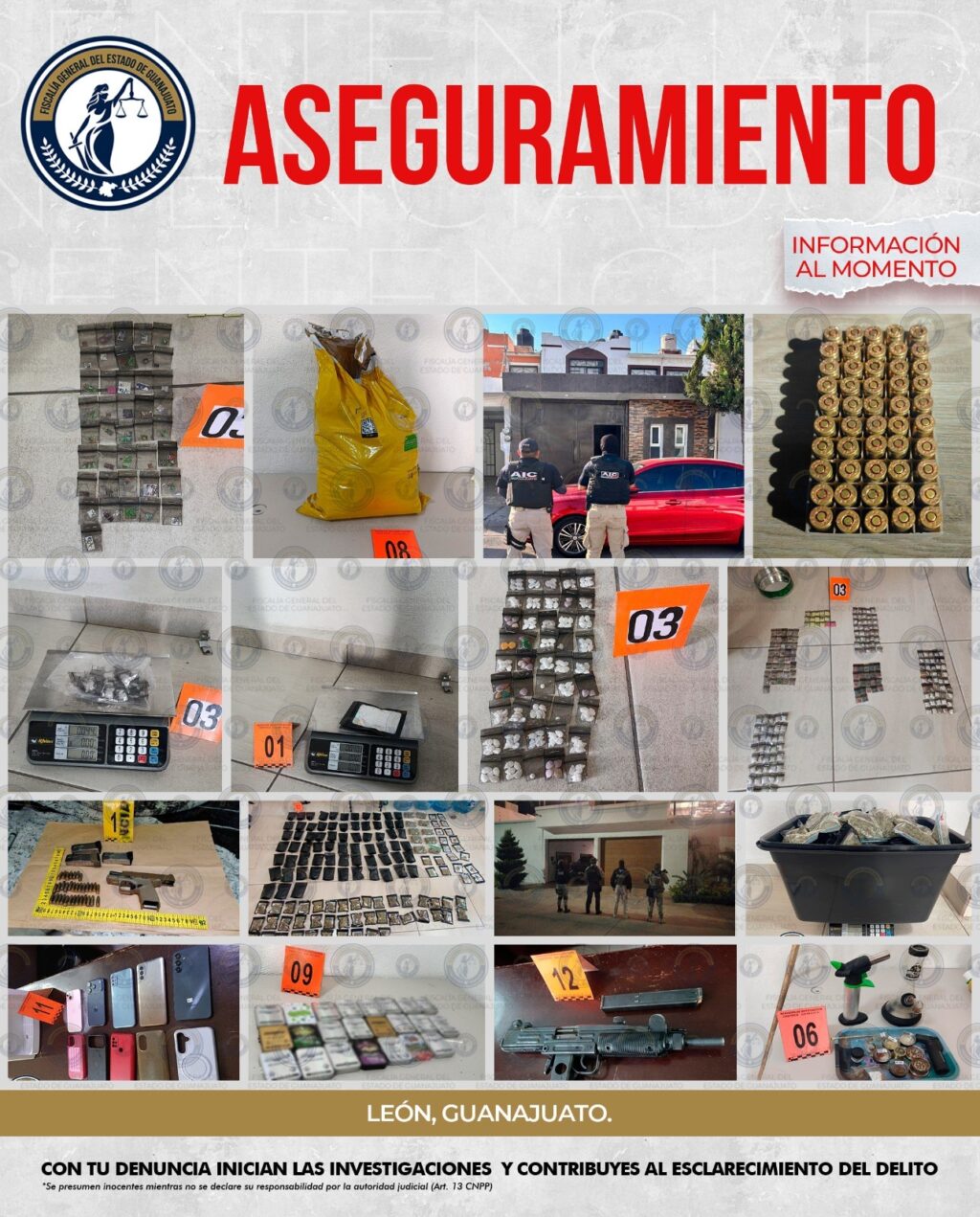 La Fiscalía General del Estado de Guanajuato, a través de la Fiscalía Regional A, llevó a cabo dos diligencias de cateo en inmuebles ubicados en las colonias Villa de los Ángeles y Bosques de la Pradera, en la ciudad de León, como parte de acciones estratégicas para el combate a la delincuencia. Como resultado de estos cateos, se logró el aseguramiento de diversos objetos y sustancias, entre los que destacan:
